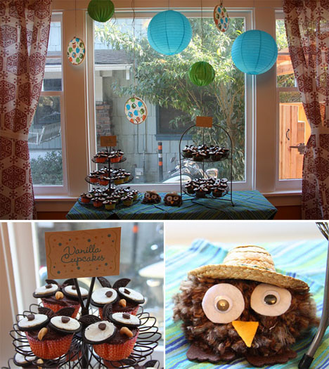 Yarn owls wearing sombreros, perched by the cupcakes. I loved the way the embroidery hoops and lanterns hung above the desserts looked.
